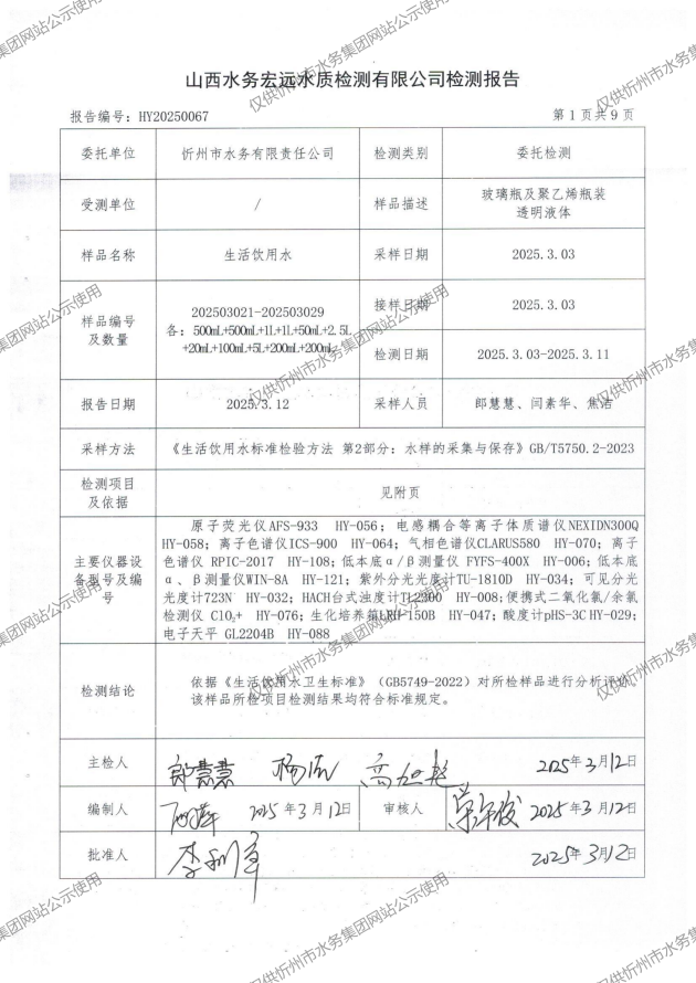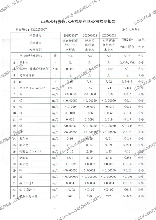 忻州城區(qū)公共供水水源水、出廠水、管網(wǎng)水、管網(wǎng)末梢水2025年3月份水質(zhì)信息公示