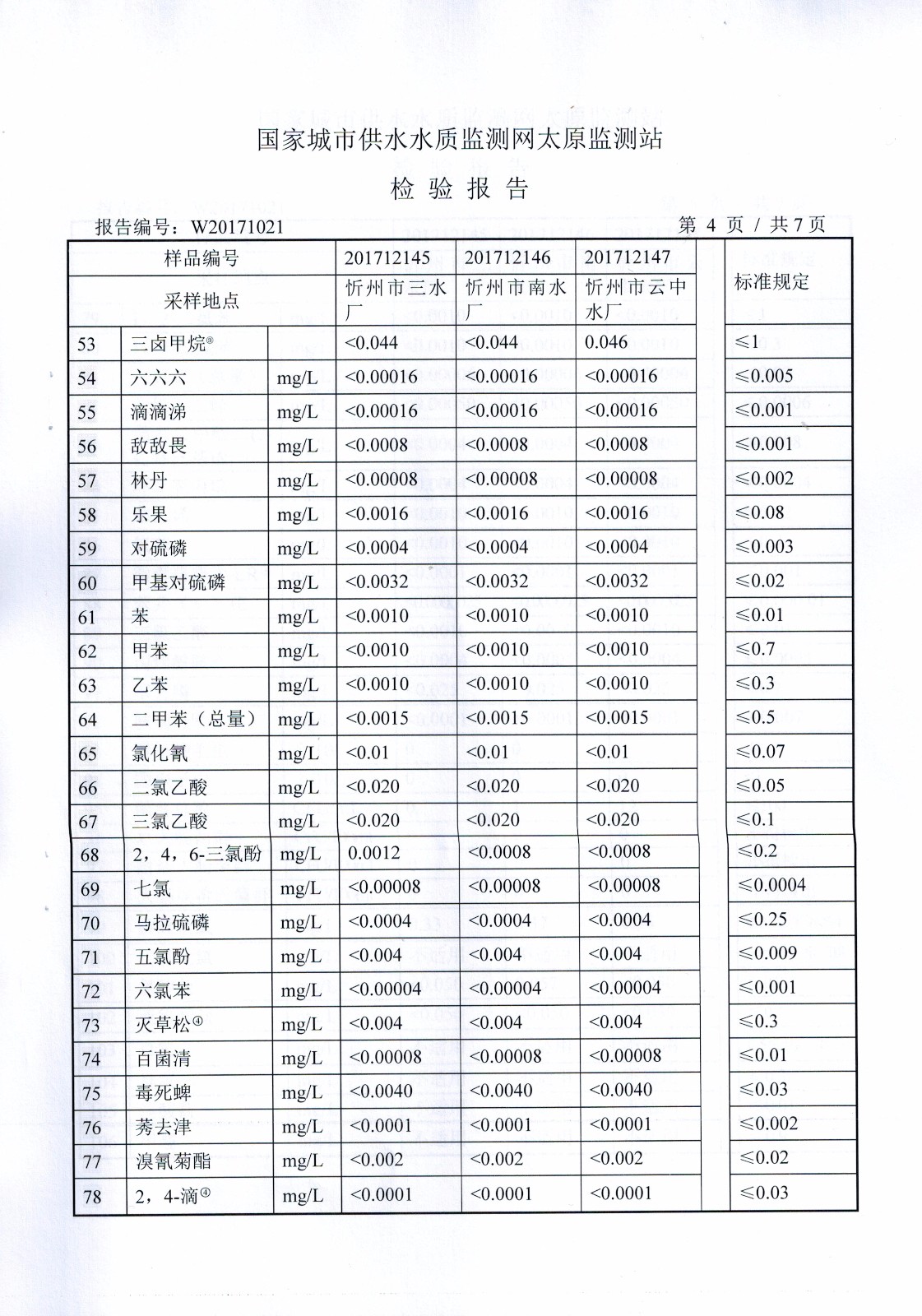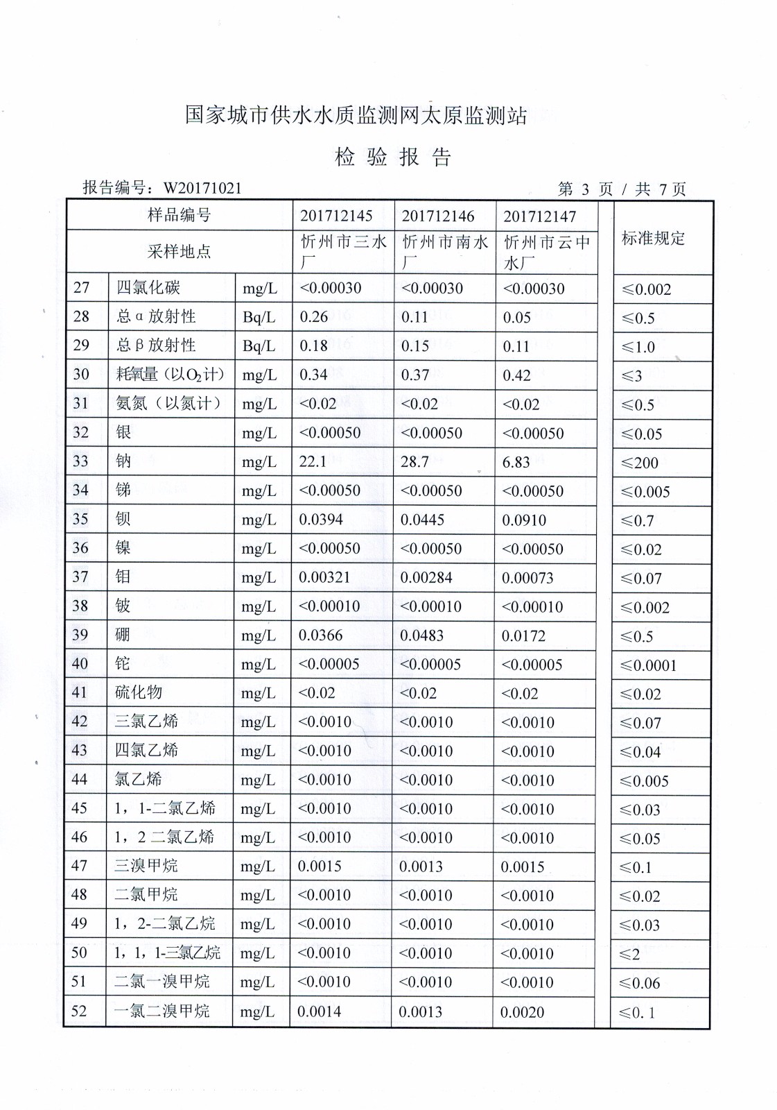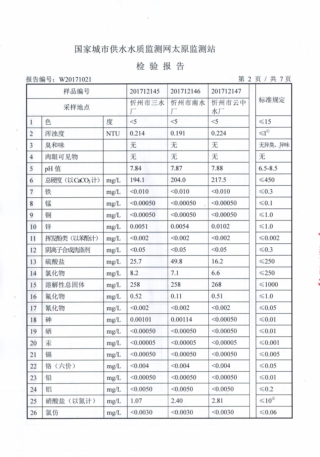 2017年忻州城區(qū)公共供水南水廠、三水廠、云中水廠出廠水106項(xiàng)水質(zhì)全分析
