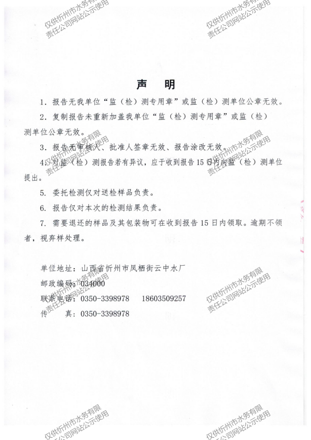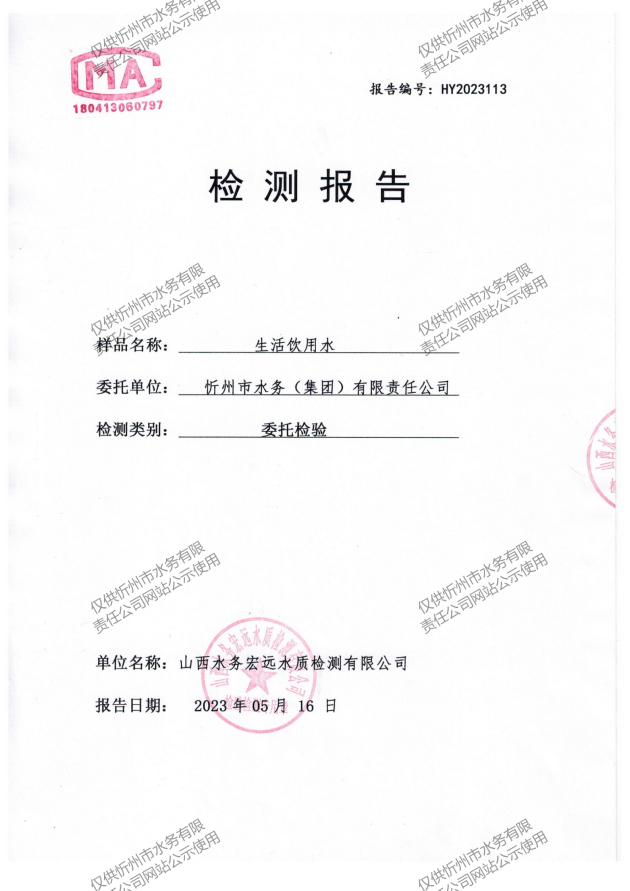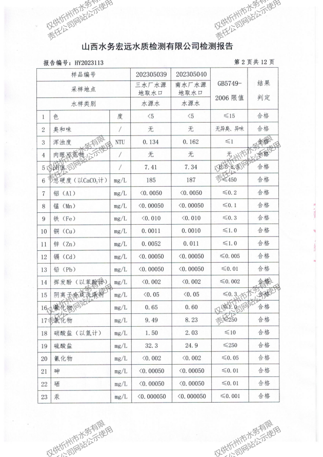 忻州城區(qū)公共供水水源水、出廠水、管網(wǎng)水、管網(wǎng)末梢水2023年5月份水質信息公示